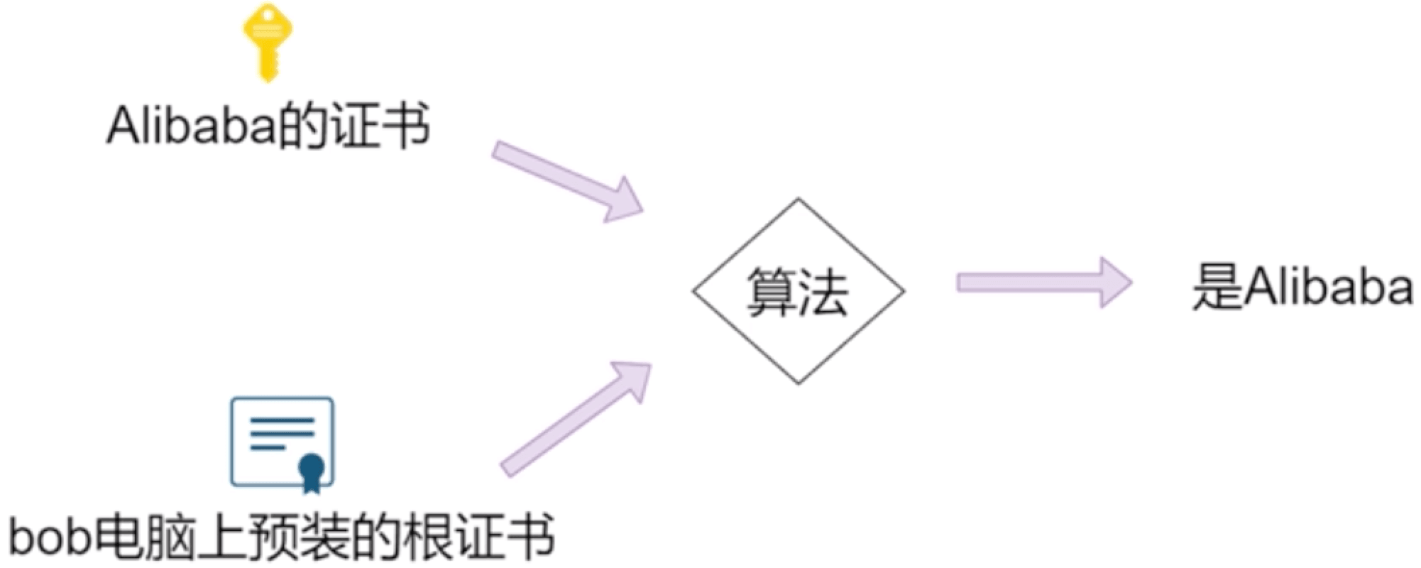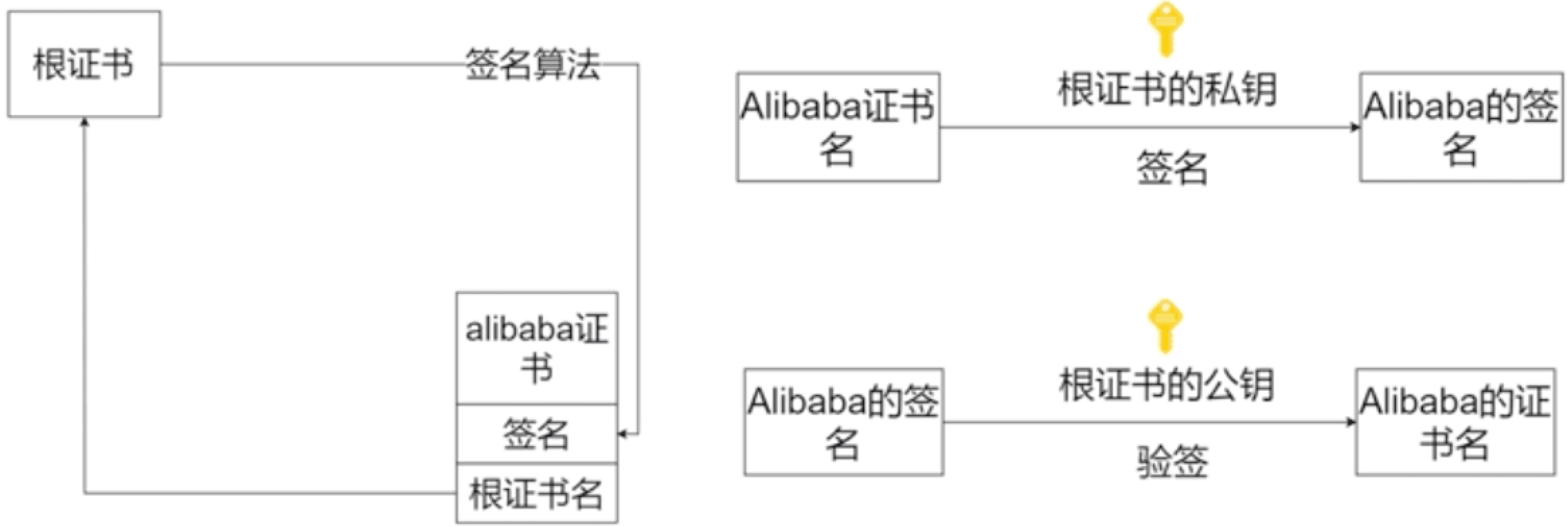 Alibaba向第三方证书机构申请证书,第三方机构用根证书的私钥给Ailibaba证书签名;然后可以用根证书的公钥进行验证签名是不是alibaba的证书。