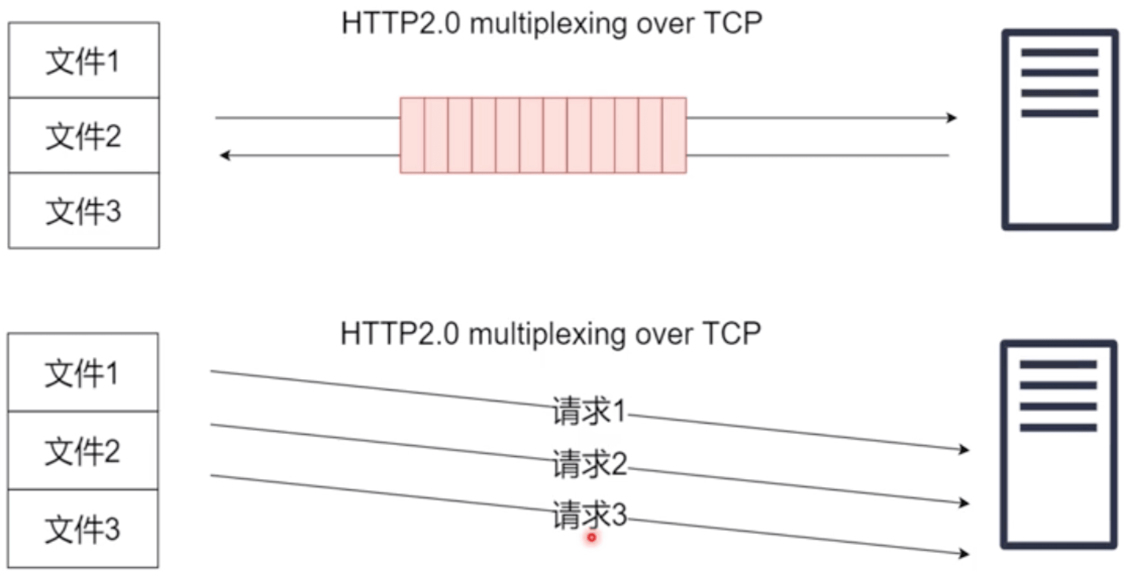 http2.0的解决,把3个请求打包成一个小块发送过去,即使第一个阻塞了,后面2个也可以回来;相当于3个文件同时请求,就看谁先回来谁后回来,阻塞的可能就后回来,对带宽的利用是最高的;但没有解决TCP的对头阻塞,如果TCP发过去的一个分包发丢了,他会重新发一次;http2.0的解决了大文件的阻塞。