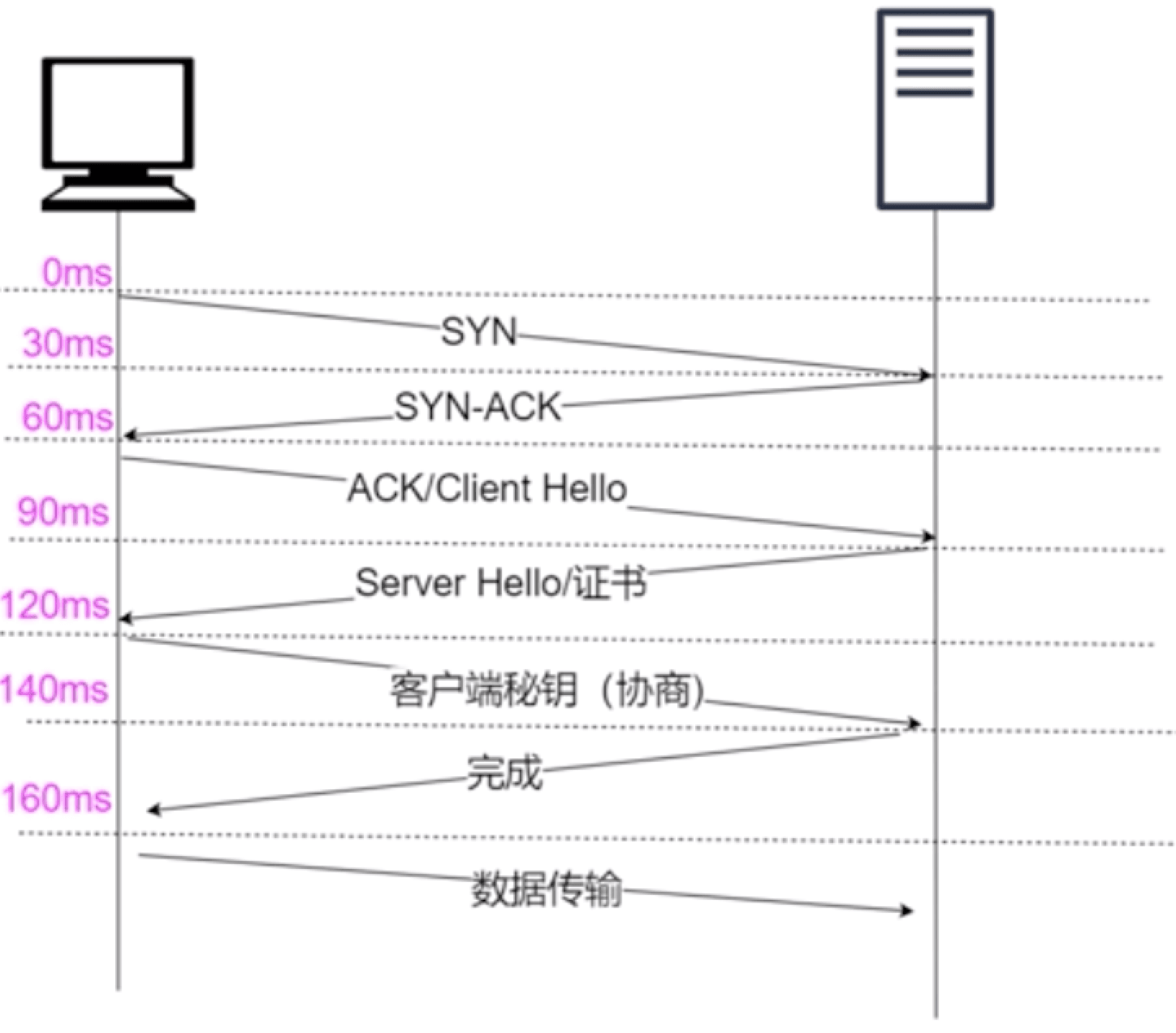 假如有30ms网络延迟,假如用https发送一条数据,服务端收到到确认成功,最少使用多少时间?