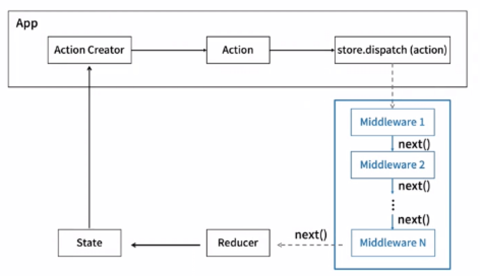 applyMiddleware接受一系列插件,每个插件(middleware)都会以dispatch和getState作为参数,并返回一个函数;该函数会被传入下一个插件中,直到调用结束。